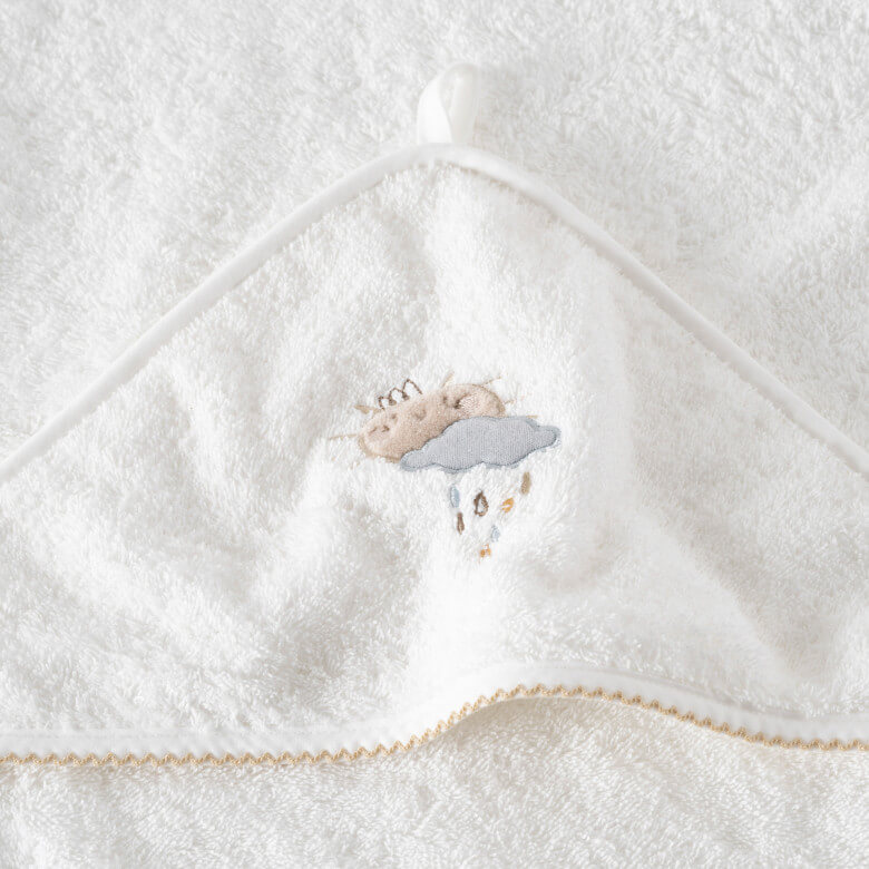 BIENVENUE kolekcijos vaikiškas kilpinis rankšluostis su gobtuvu pagamintas iš 100% organinės medvilnės. Rankšluostis puoštas saulytės ir debesėlio aplikacija, kraštai apsiūti audinio juostele, rankšluostis turi pakabinimui skirtą kilpelę. Organinė medvilnė turi ypatingas savybes: minkštumą, švelnumą ir puikiai sugeria drėgmę! Gamyboje naudojama tik augaliniai dažai, kad nesukeltų alergijos, rankšluosčio tankis – 480g/m².
