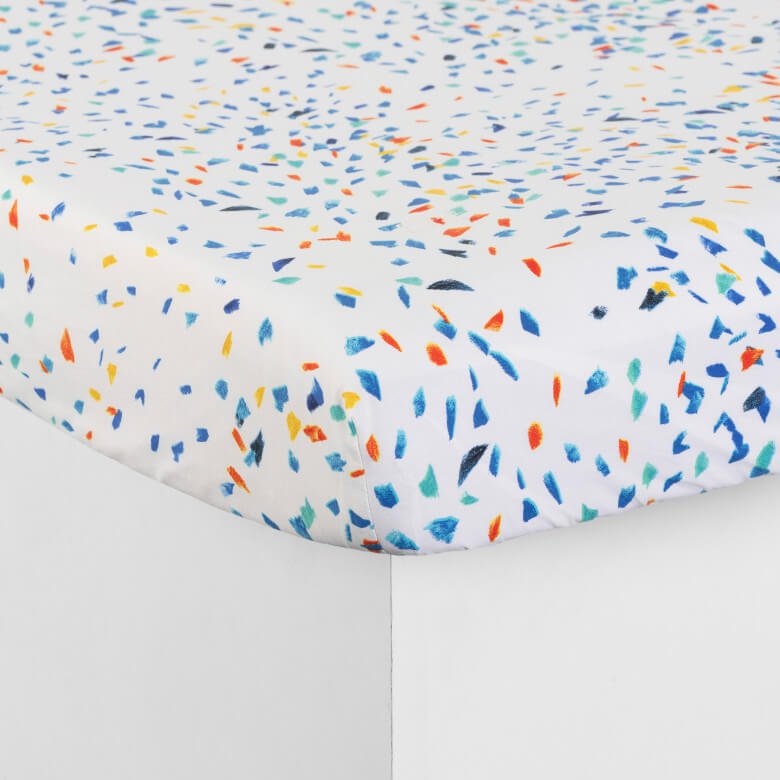 TADAM kolekcijos paklodė su guma marginta konfeti lietumi. Paklodė puikiai tinka norintiems daugiau spalvų ir idealiai tinka vaikų miegamojo kambariui. Paklodė pagaminta iš 100% organinės medvilnės, audinio tankis 57 dygsniai/cm², turi 30cm aukščio juostą aptraukti čiužinį.